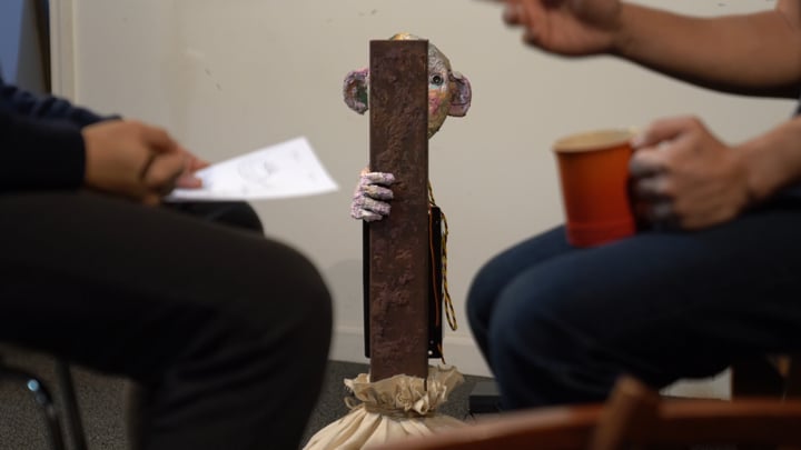 The sculpture features a sculpted boy’s face partially concealed behind a vertical timber structure. Hidden but not absent, he slowly peeks out from either side as if gathering the courage to engage. This gesture unfolds only in solitude. When the space is empty, the boy becomes alert and gently emerges to observe. But when a person enters, his behavior changes. Startled, he swiftly hides, face tucked back behind the timber. He waits in stillness. If the visitor lingers, the boy eventually attempts another glance, cautiously testing the distance between himself and the world.
